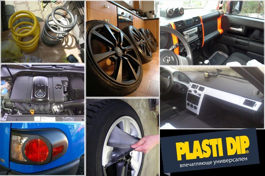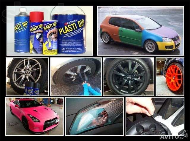 "PLASTI DIP" доступен в банках 3,78 л и спреях 325 мл. разнообразных цветов. Жидкое резиновое покрытие в банках объема 3.78 литра и более называется Rubber Dip.