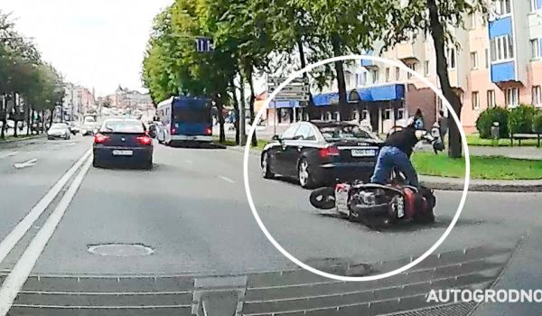Читательница АвтоГродно стала очевидцем необычной ситуации на проспекте Космонавтов – водитель скутера упал, когда перед ним, поворачивая направо, выехал водитель на AUDI. Показываем видео.