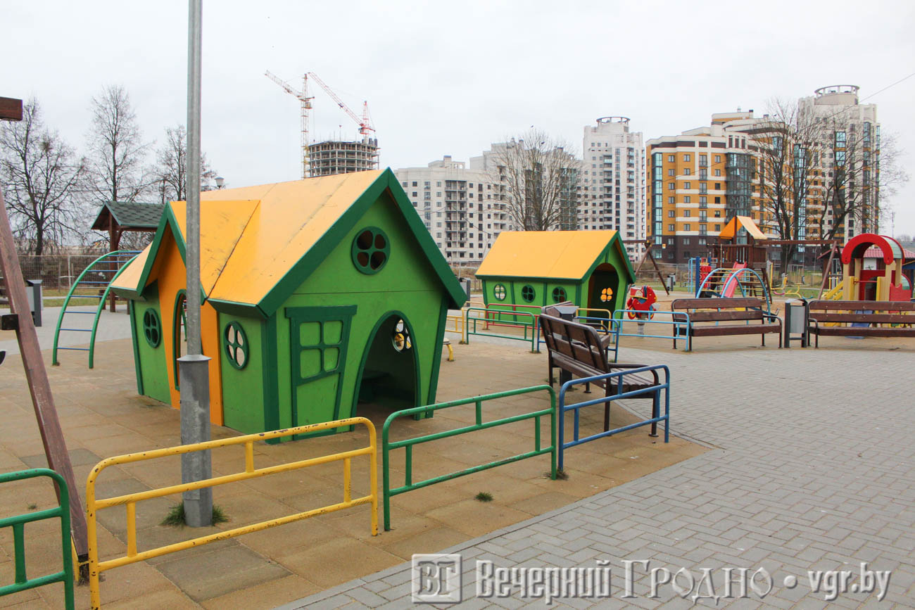 Несмотря на пасмурную погоду во дворах сразу бросаются в глаза яркие домики на детских площадках, рассказывает "Вечерний Гродно".