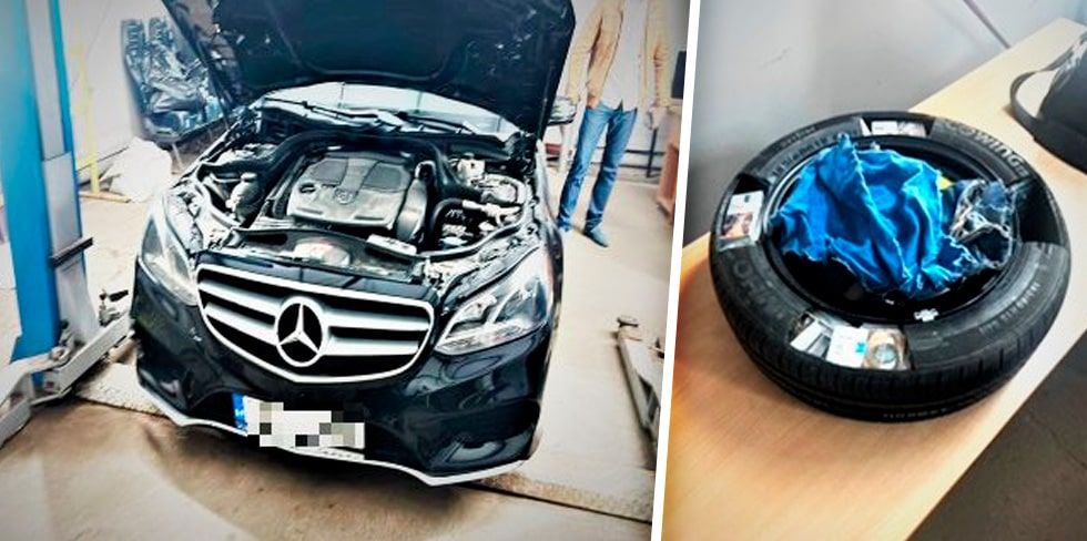 При проверке Мерседеса на рентген-установке выяснилось, что в запасном колесе автомобиля, в передней части под ковром со стороны пассажира и в звуковой колонке есть тайники. Поработав отверткам, пограничники изъяли из тайников 500 пачек сигарет.