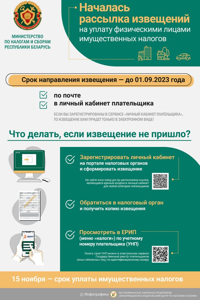 Инспекция Министерства по налогам и сборам РБ по Ленинскому району Гродно сообщает, что уже началась рассылка извещений на уплату физическими лицами имущественных налогов.