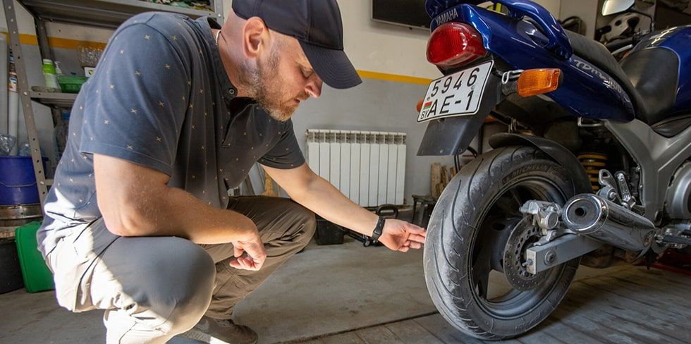 — Шины должны быть накачаны. Спускать их не надо. Тоже можно пройтись силиконом. Тормозные диски обязательно! Желательно, если байк стоит на боковой подножке, его немного прокатывать периодически — так рекомендуют некоторые производители. Это необходимо для того, чтоб точка контакта с поверхностью менялась. Если протектор не менее 3 мм, нужно подумать об их замене. Можно купить их и весной, конечно. Но цены на месте не стоят. Так что, если есть потребность и возможность, сделайте это сейчас — покупаем заранее.
