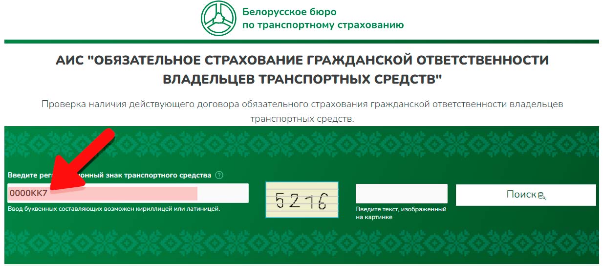Чтобы проверить срок действия страховки онлайн, зайдите на сайт бюро страхования по этой ссылке и введите в поле в левое поле номер автомобиля без пробелов (буквы могут быть и на кириллице, и на латинице):