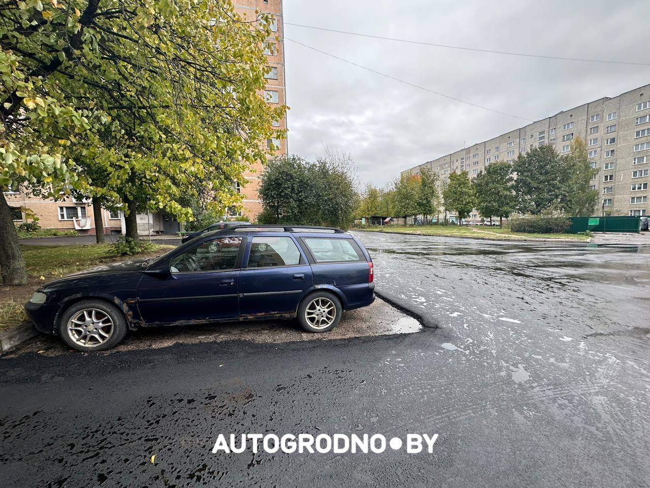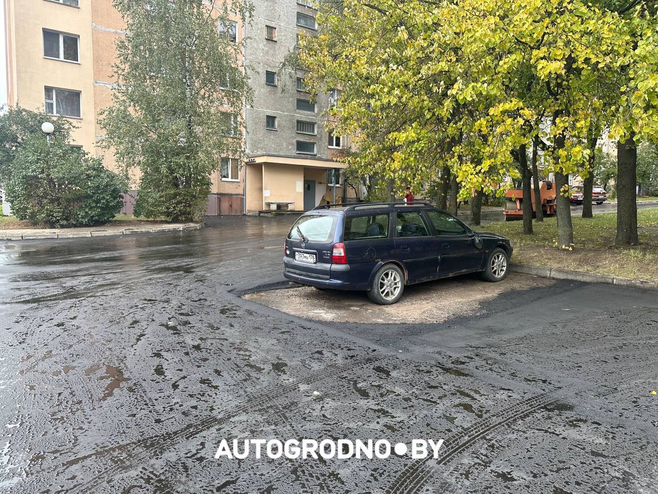 Дело в том, что вчера, 11 октября, туда приехали дорожники. В планах – долгожданное для всех жителей сплошное асфальтирование. Но все пошло немного не так. Всему причиной – припаркованный уже давно Opel на российской регистрации. С места его не убрали и поэтому асфальт положили ровненько вокруг машины.