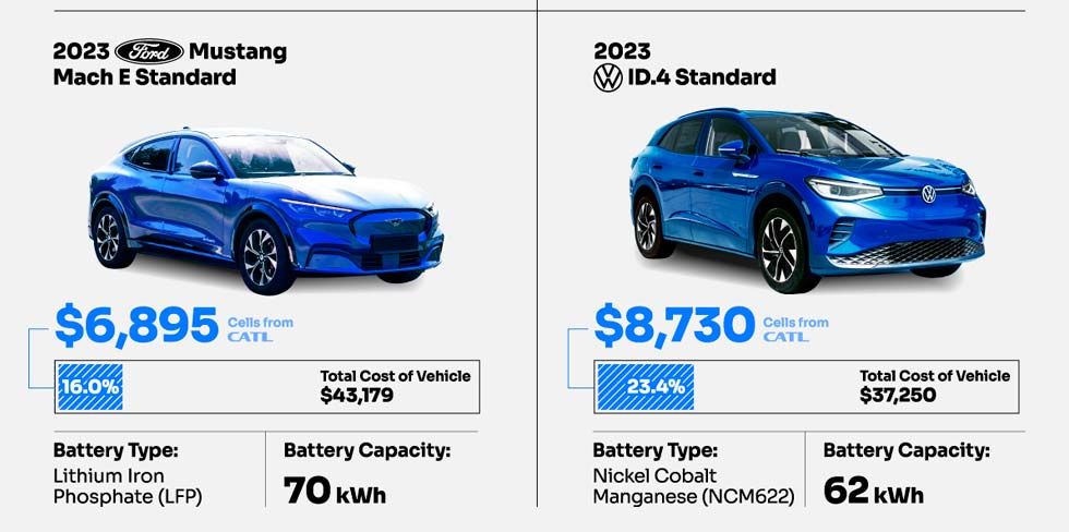 | Ford Mustang 2023 года | Литий-железо-фосфат (LFP) | 70 кВтч | 6895 долларов США | 43 179 долларов США |