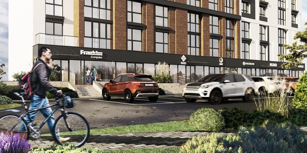Парковка немного удалена от дома, чтобы защитить жителей от выхлопных газов. Число машиномест совпадает с количеством квартир. Продуман и крытый велобокс.