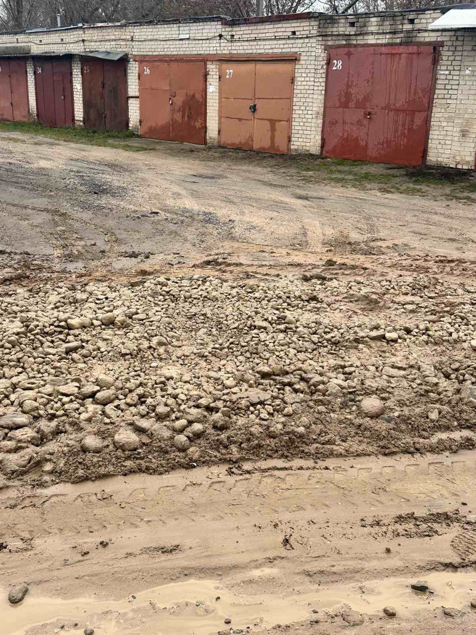 Мы привезли укрепляющий камень, подсыпали это место и сделали заезд под контейнерную площадку и в гаражный кооператив.