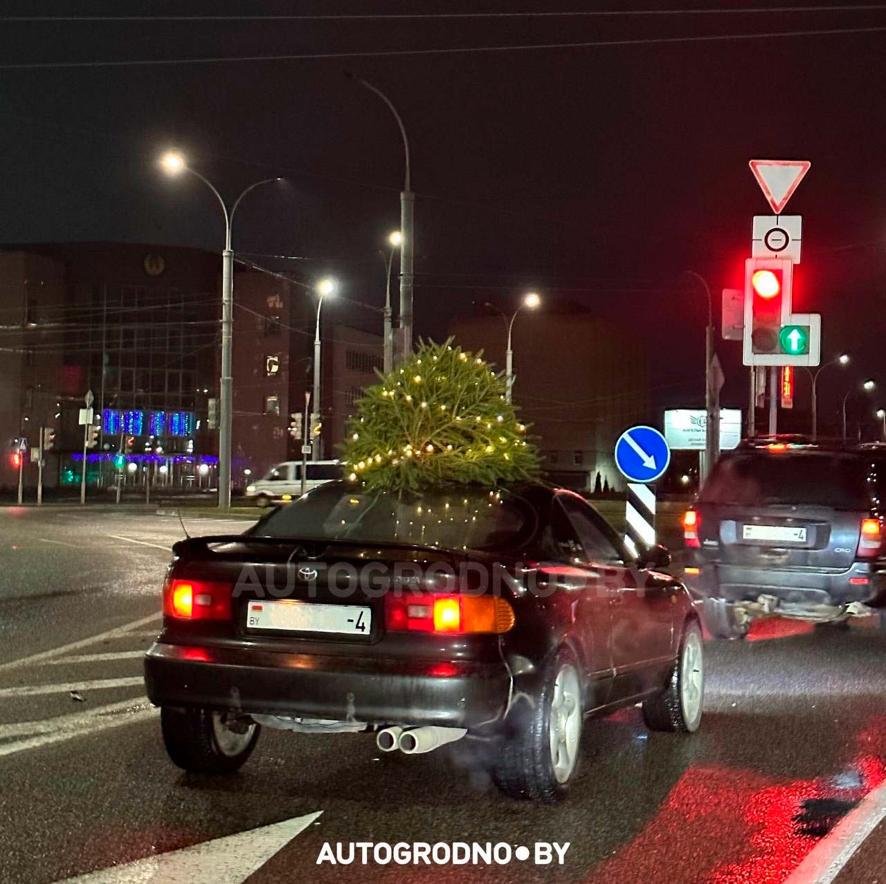 Алексей аккуратно уложил елочку на крышу своего автомобиля, украсила ее гирляндами и радует гродненцев уже с начала этой недели!