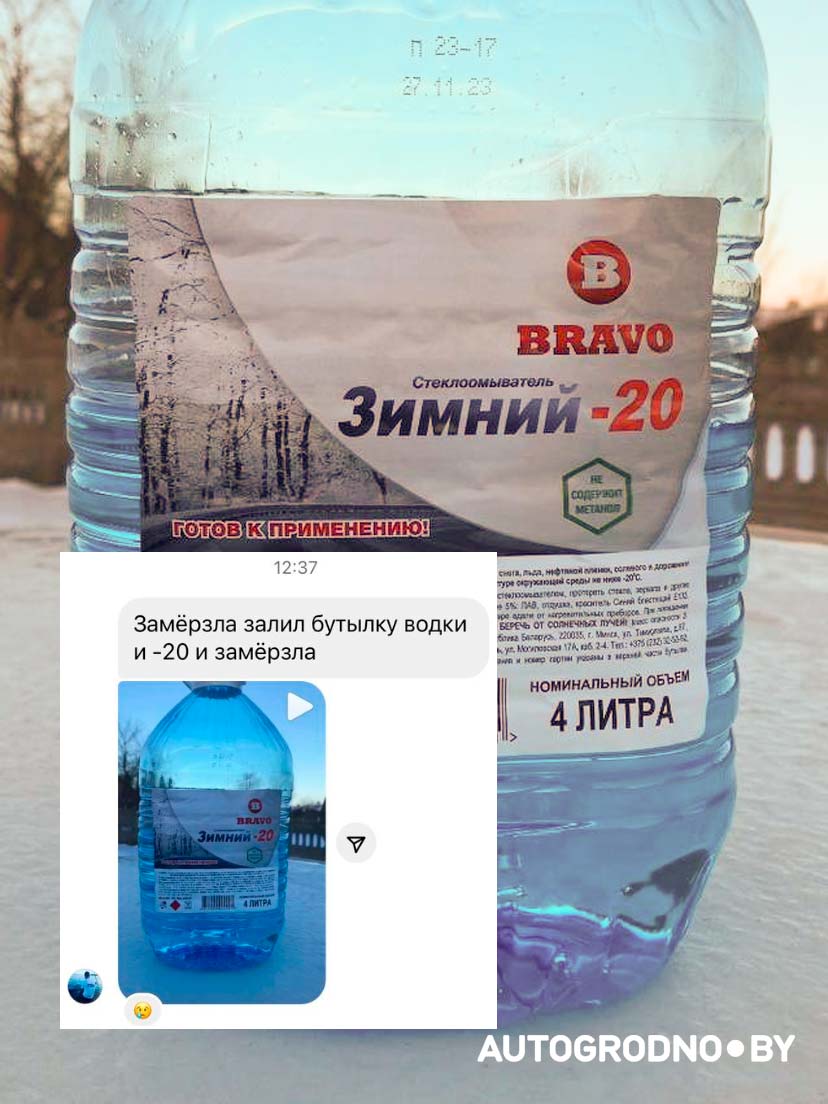 Пятый пример: жидкость BRAVO -20. В бутылке она оставалась жидкой, но в трубках стеклоочистителя замерзла. Водитель говорит, что накануне к этой жидкости добавил в бачок стеклоомывателя бутылку водки, но жидкость все равно замерзла.