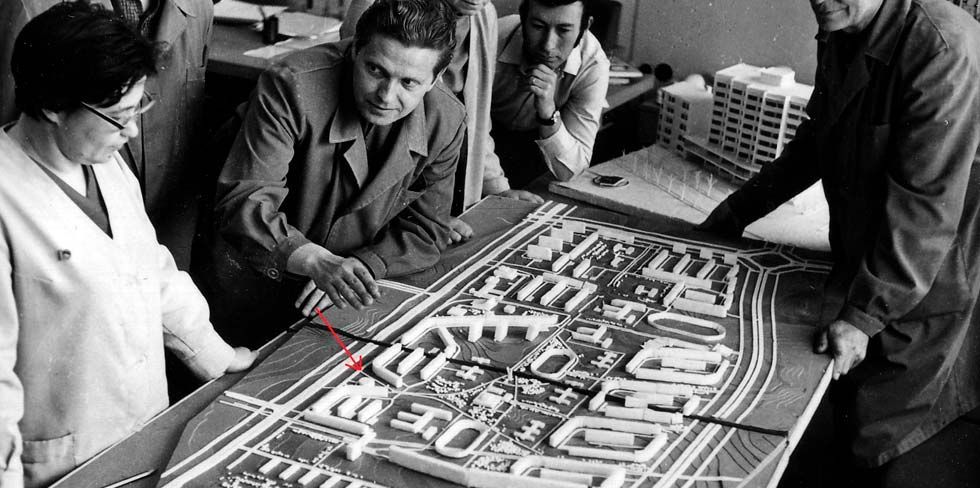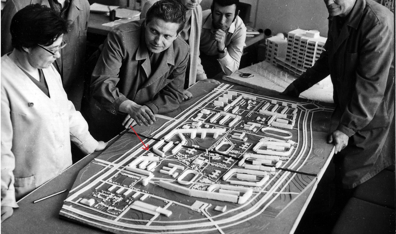Паглядзіце на фота ніжэй: гэта рэдкі знімак архітэктараў Гроднаграмадзянпраекта за работай. Са здымка бачна, што акурат на тым месцы, якое паказаны на сучасным здымку, павінна была ўзнікнуць такая невялікая плошча з нейкім круглым будынкам – крамай ці поштай, напрыклад. З другога боку вуліцы дом павінен быў быць сіметрычны першаму. Але не зраслося, як тое часта бывала. У пачатку 80-х паўстаў гэты цагляны дзевяціпавярховік, я яшчэ памятаю яго дабудову. А збоку прыклеілі офіс тэлебачання "Гарант". На гэтым планы пра сіметрыю скончыліся.