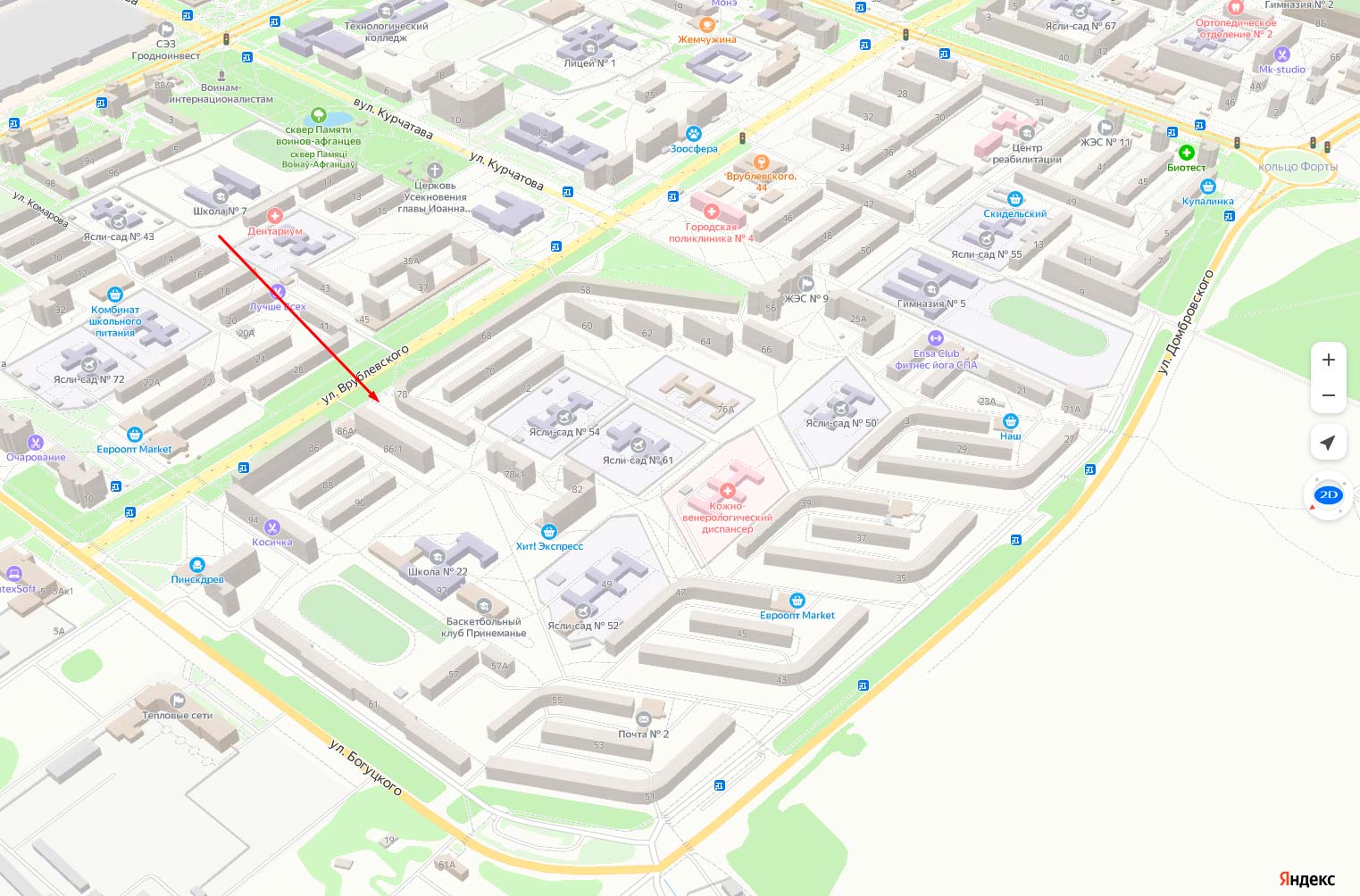 А вот как улица Врублевского и Домбровского выглядят в реальности (снимок с Яндекс.Карт), схожесть около 80%: