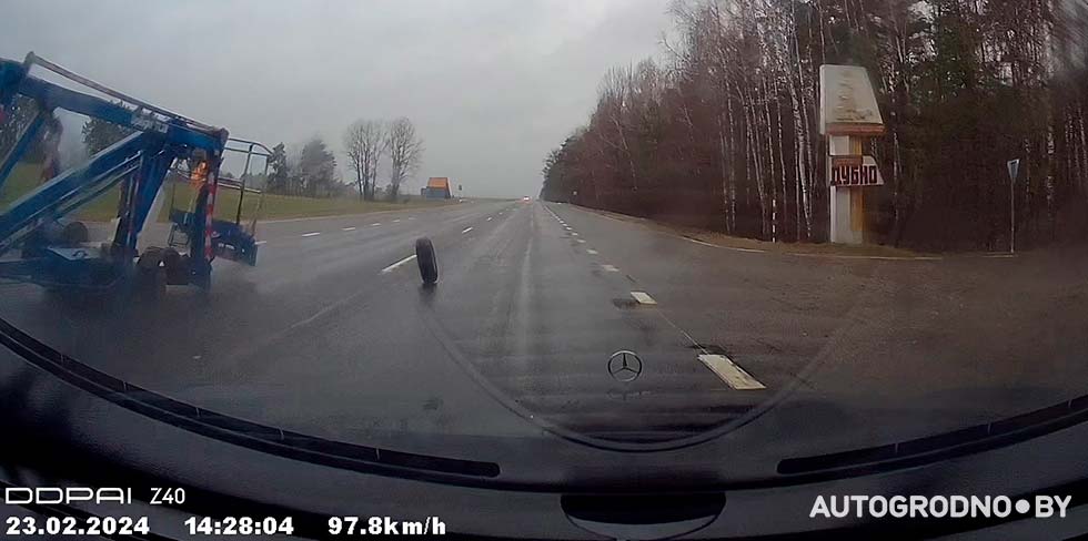 Сегодня читатель АвтоГродно показал мастерство на дороге вблизи агрогородка Дубно. На скорости около 90 км/ч он заметил, как впереди от прицепа отрывается колесо и движется прямо на него.