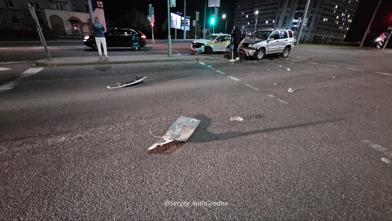 Сегодня ночью, около двух часов, на кольце Дубко столкнулись Skoda службы такси и Suzuki. Скорее всего, ситуация выглядела так: кроссовер двигался от "Олд Сити" к кольцу Тавлая по прямой, а автомобиль такси двигался по кольцу.