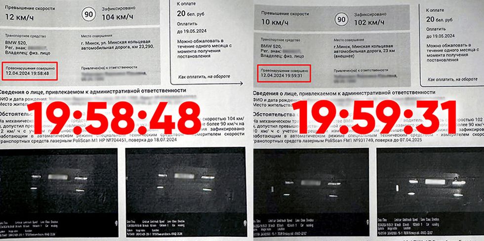 Смотрим в постановления: разрешенная скорость на участке – 90 км/ч, одна камера зафиксировала скорость в 102 км/ч (превышение, указанное в постановлении, на 10 км/ч), другая – в 104 км/ч (превышение на 12 км/ч). Действительно, не рекордные показатели. Первое нарушение зафиксировано в 19:58:48, второе – в 19:59:31, то есть спустя 43 секунды.