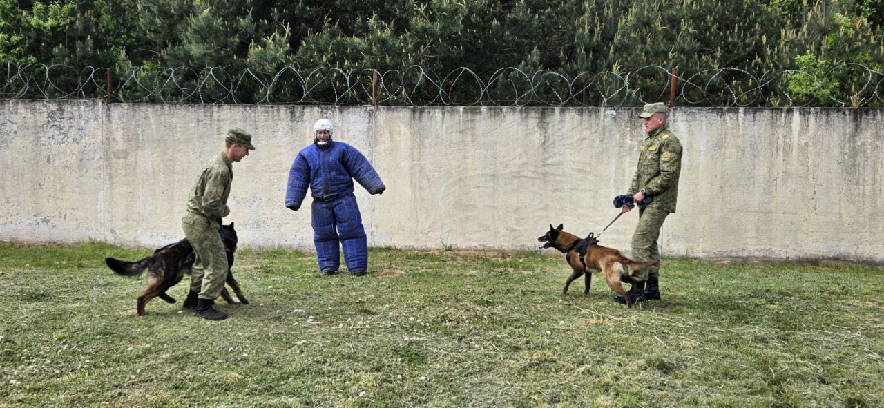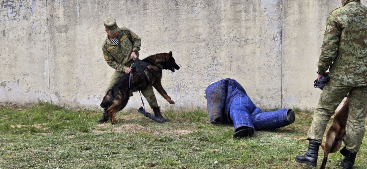 После пограничники показали, как служебные собаки задерживают нарушителей границы. Для этого один из тренеров надел защитный костюм со шлемом, ему дали 30 секунд на то, чтобы убежать от собак, которые вскоре настигли и повалили мужчину на землю: