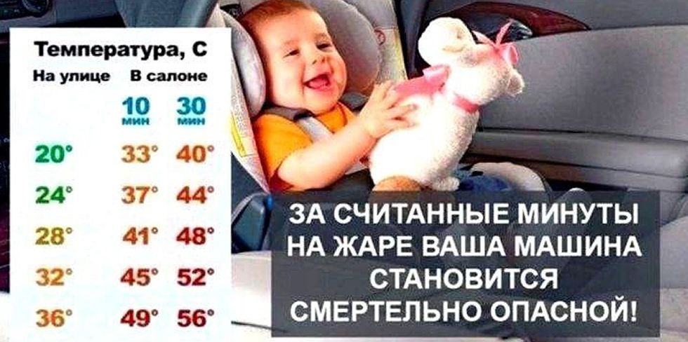 "Тело ребенка нагревается в три-пять раз быстрее, чем у взрослого человека. Когда температура воздуха в машине достигает + 40 градусов основные органы детей, оставленных на жаре в авто, начинают отказывать, а при температуре + 41 – 42 градуса может произойти непоправимое. Салон машины нагревается очень быстро: всего за 10 минут температура воздуха в автомобиле поднимается на 11 градусов. То есть в жаркую погоду критическая для ребенка температура образуется уже через 15-20 минут, а открытое окно или кондиционер не сильно охлаждают автомобиль, когда мотор заглушен", – обратили внимание в ГАИ Минска.