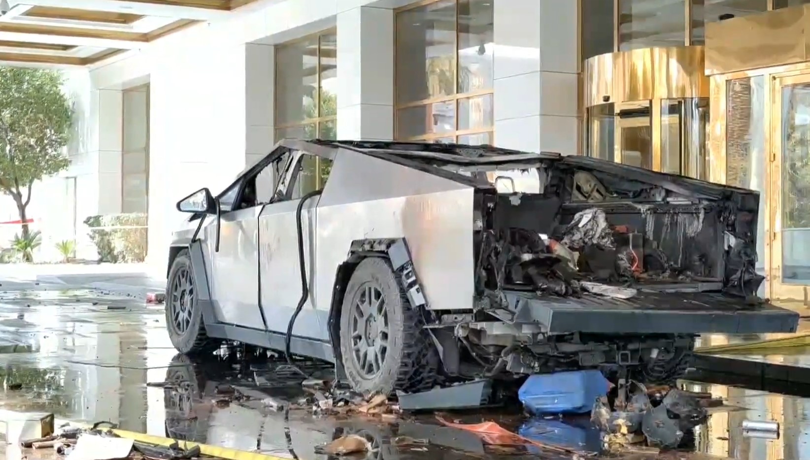 Появились кадры последствий взрыва Tesla Cyber Truck у башни Трампа в Лас-Вегасе.