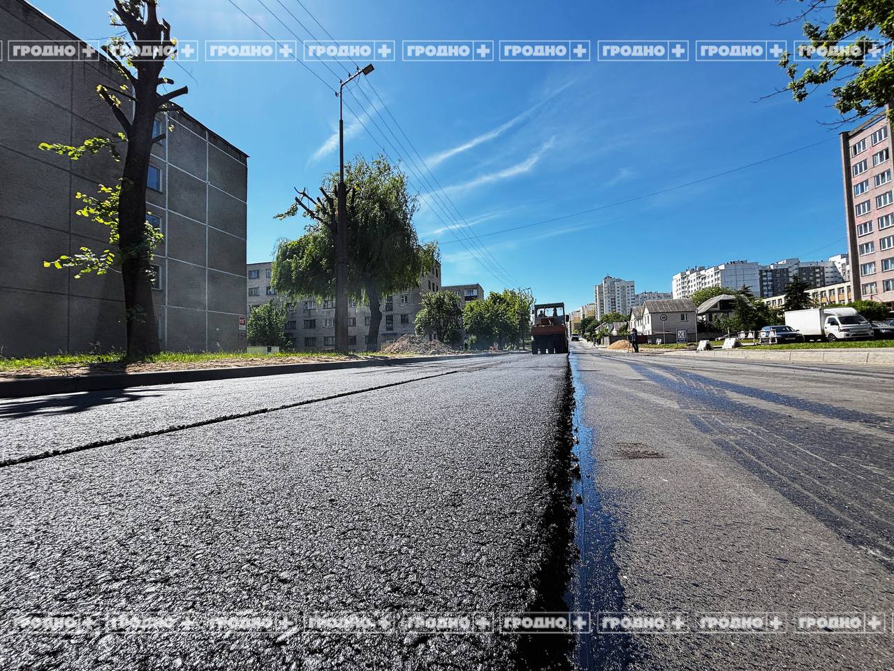 Сотрудники "Ремстройавтодоа" сняли старое покрытие, на его месте в два этапа укладывают новый асфальт, сообщает телеканал "Гродно Плюс".