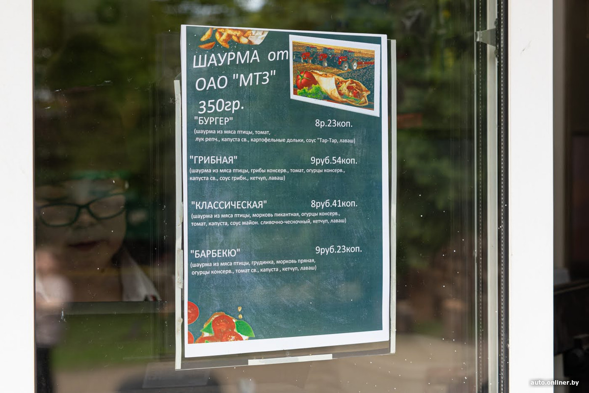 Наряду с многочисленными классическими точками общепита (мороженое, чебуреки, смажни и беляши) есть на территории МТЗ и своя шаурмичная. На выбор клиентам предлагают сразу четыре варианта вкуса: бургер, грибная, классическая и барбекю.