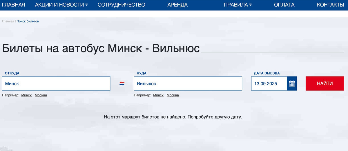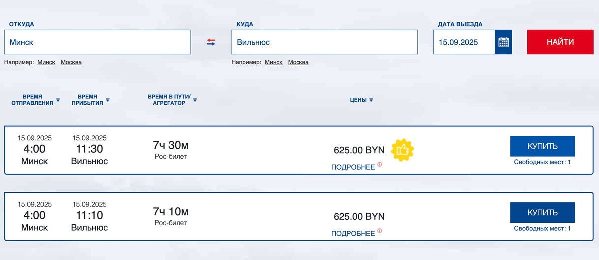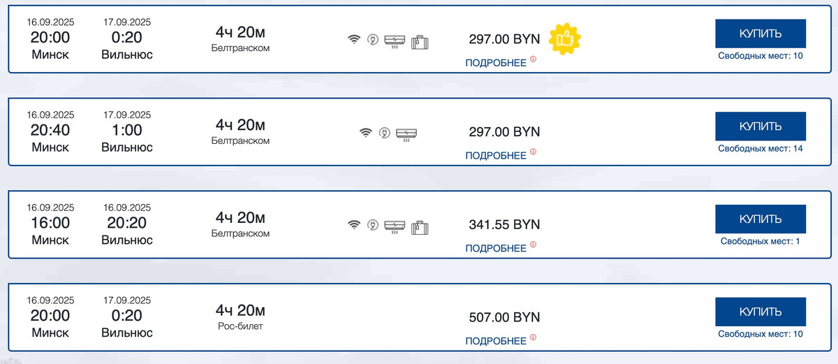 На сайте Intercars нашли рейс из Минска в Вильнюс на 11 сентября с отправлением в 13 часов — билет стоит 242 рубля. Варианты на 12 число также имеются и обойдутся в 230—341 рубль. А вот на 13—14 сентября на момент подготовки материала билетов не предлагалось, а на 15-е они стоят уже 625 рублей. На более поздние даты билеты также имеются, даже можно найти варианты дешевле 300 рублей.