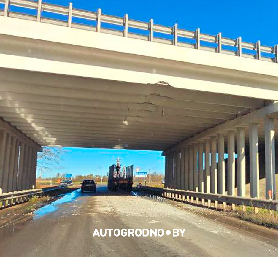 Читатели АвтоГродно сообщают, что повреждение путепровода не критично – пострадала облицовка балок.