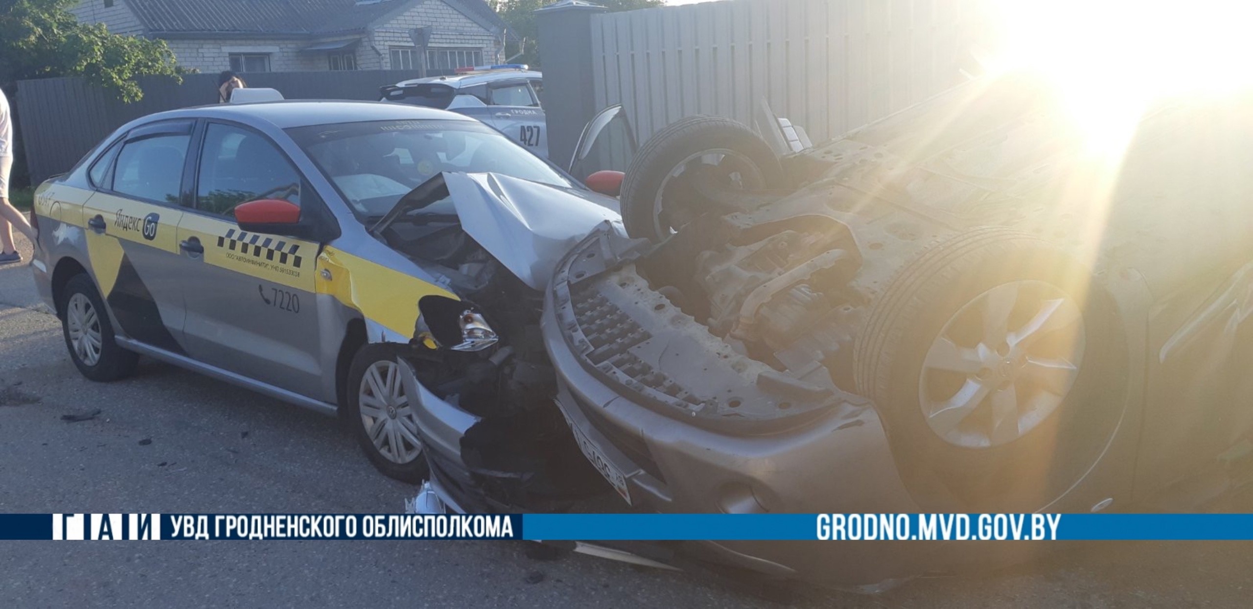 Сегодня, 5 июня, около 19:20 в м-не Фабричный в Гродно произошла серьезная авария: в результате столкновения VW из службы такси и легкового Nissan, последний оказался на крыше.