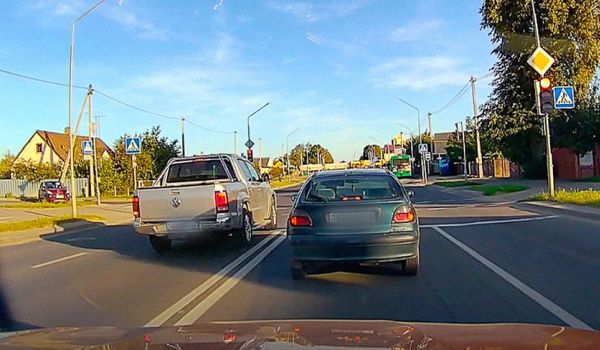 Случай с тремя "П" (перекресток-пикап-поворот) произошел в Лиде вчера, 15 августа. На перекрестке Свердлова и Чехова пикап нестандартно проезжает пересечение, а потом поворачивает налево.