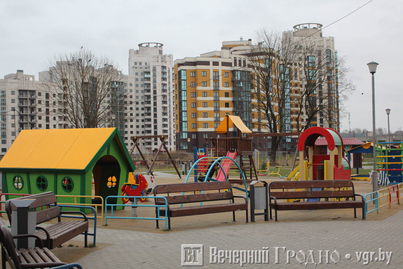 Несмотря на пасмурную погоду во дворах сразу бросаются в глаза яркие домики на детских площадках, рассказывает "Вечерний Гродно".