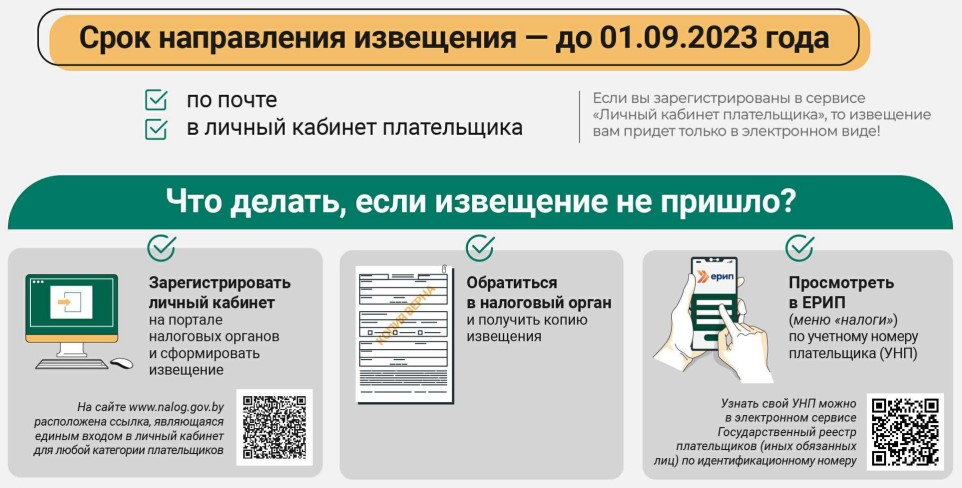 Известно, что срок направления извещения - до 1 сентября 2023 года. Оно может прийти по почте или в личный кабинет плательщика (если вы зарегистрированны в "Личном кабинете плательщика", то извещение придет только в личный кабинет в электронном виде).