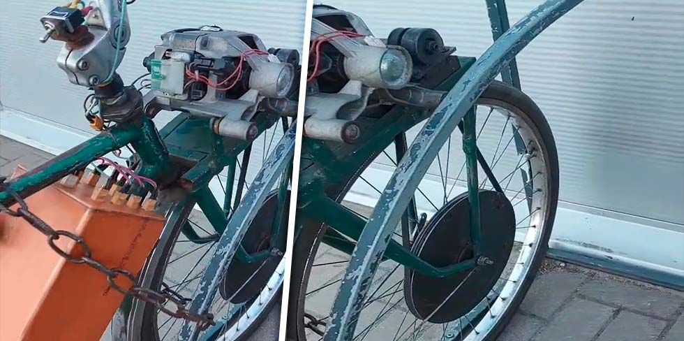 На записи видно, что умелец доработал обычный велосипед "взрослик" времен СССР. Он установил над передним колесом дополнительную площадку, на которой закрепил электромотор. Скорее всего, от стиральной машины.