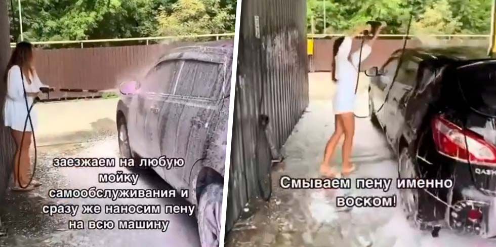 Девушка на видео моет автомобиль совершенно без механического воздействия. Она наносит пену, а затем смывает ее воском, который также чаще всего на мойках самообслуживания наносится под низким давлением. Итак, первой и важной составляющей в ее способе уже нет.