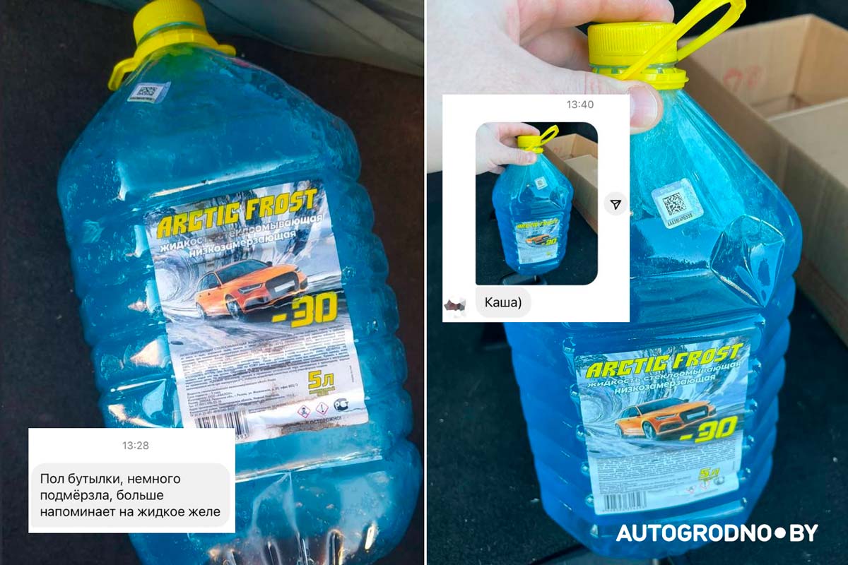 Сегодня в чатах и социальных сетях водители показывают, что произошло с их незамерзайками при температурах от -17°C до -20°C. Даже те жидкости, на этикетках которых указаны громкие надписи -30°C и "Наноформулы", превратились в камень. Но есть и явные победители. АвтоГродно собрал фотографии от автомобилистов, получился "народный тест-драйв" незамерзаек 2024.