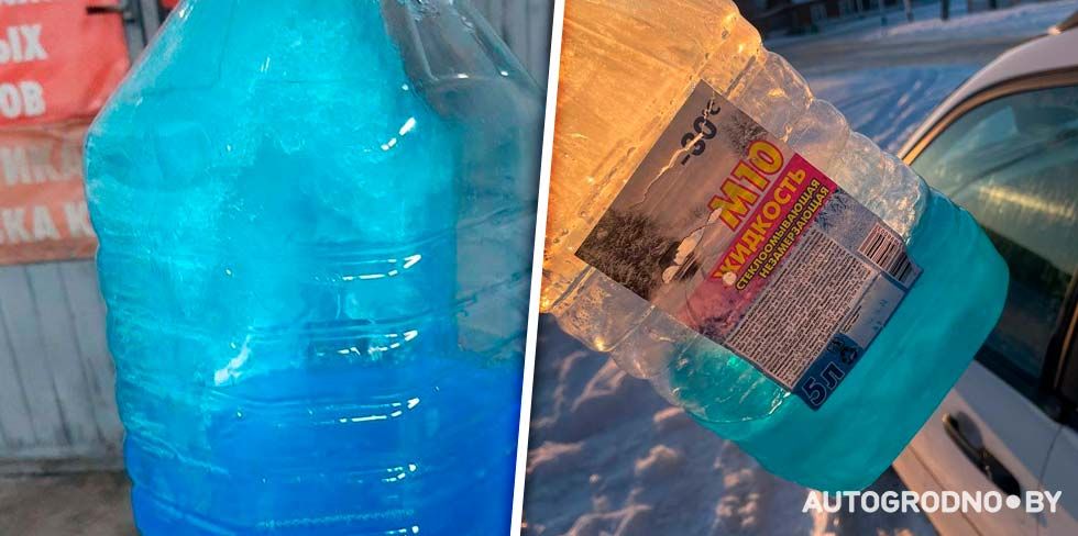 Пятый пример: жидкость BRAVO -20. В бутылке она оставалась жидкой, но в трубках стеклоочистителя замерзла. Водитель говорит, что накануне к этой жидкости добавил в бачок стеклоомывателя бутылку водки, но жидкость все равно замерзла.