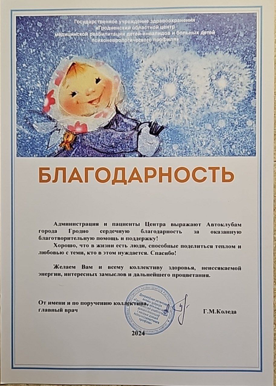 Следом автоклубы посетили "Гродненский областной центр медицинской реабилитации детей-инвалидов и больных детей психоневрологического профиля", где подарили светодиодную инсталляцию и гимнастические принадлежности.