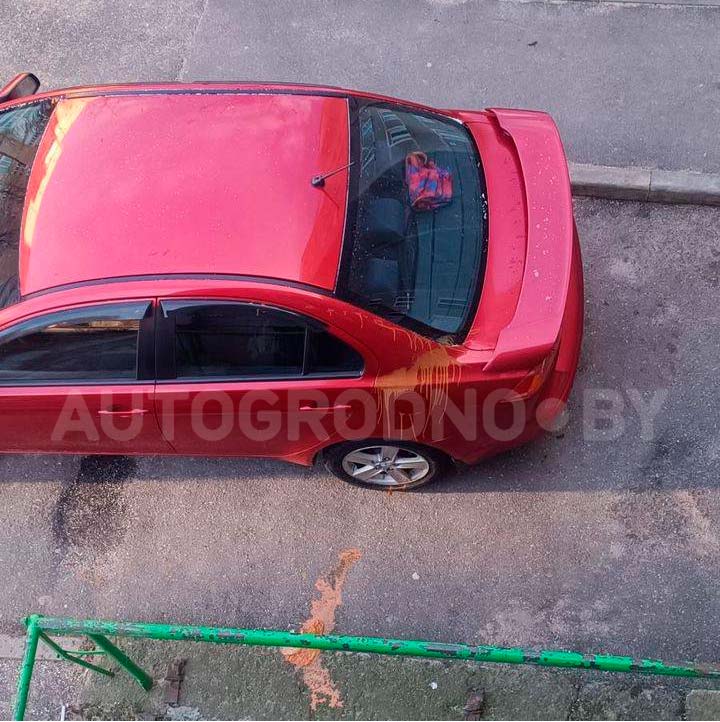 Читательница АвтоГродно вышла к своей машине и увидела, что ее Mitsubishi облита краской. Кто-то скинул из окна пакет с краской, а ранее сверху летели яйца.