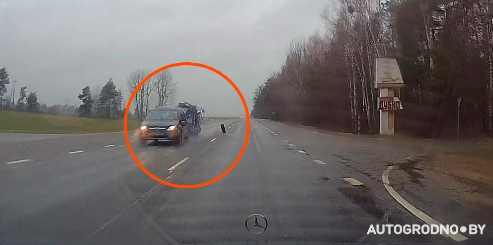 Сегодня читатель АвтоГродно показал мастерство на дороге вблизи агрогородка Дубно. На скорости около 90 км/ч он заметил, как впереди от прицепа отрывается колесо и движется прямо на него.