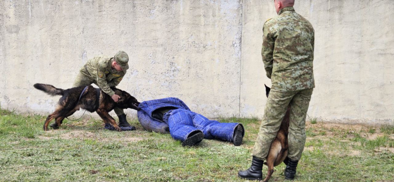 После пограничники показали, как служебные собаки задерживают нарушителей границы. Для этого один из тренеров надел защитный костюм со шлемом, ему дали 30 секунд на то, чтобы убежать от собак, которые вскоре настигли и повалили мужчину на землю: