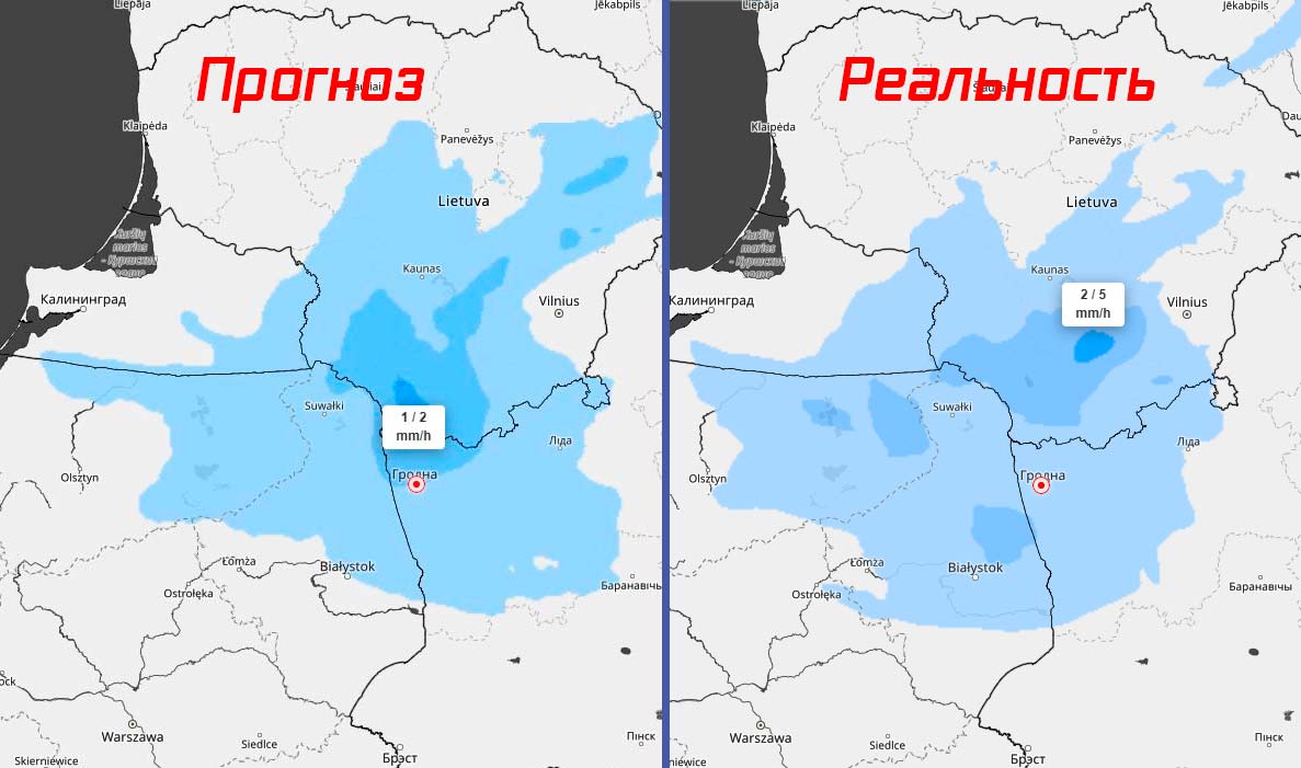 Например, зарубежный сервис погоды скорректировал свой прогноз, согласно которому эпицентр снежной массы прошел значительно севернее Гродно, чем предполагалось. Показываем, как прогноз снежного фронта выглядел вчера и днем и сегодня ночью: