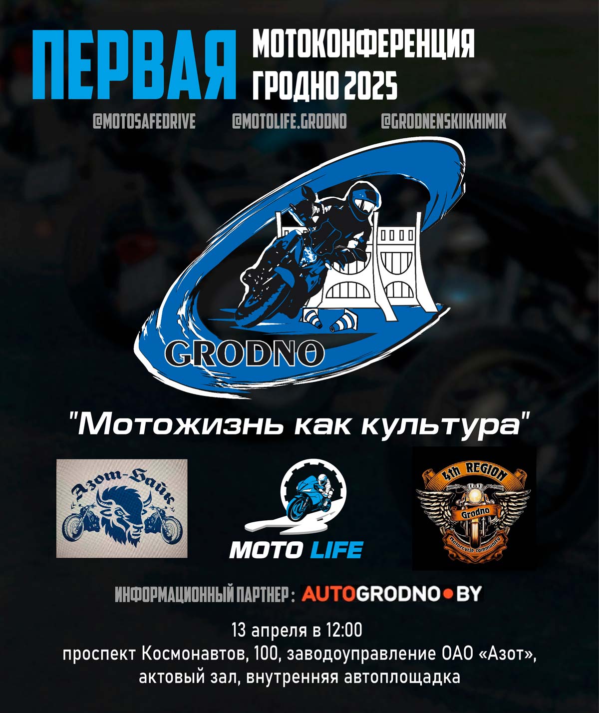 Мотоконференция – это социальный проект Мотоджимхана Гродно @motosafedrive, мероприятие проводится при поддержке ГродноАзот и Госавтоинспекции Гродно.
