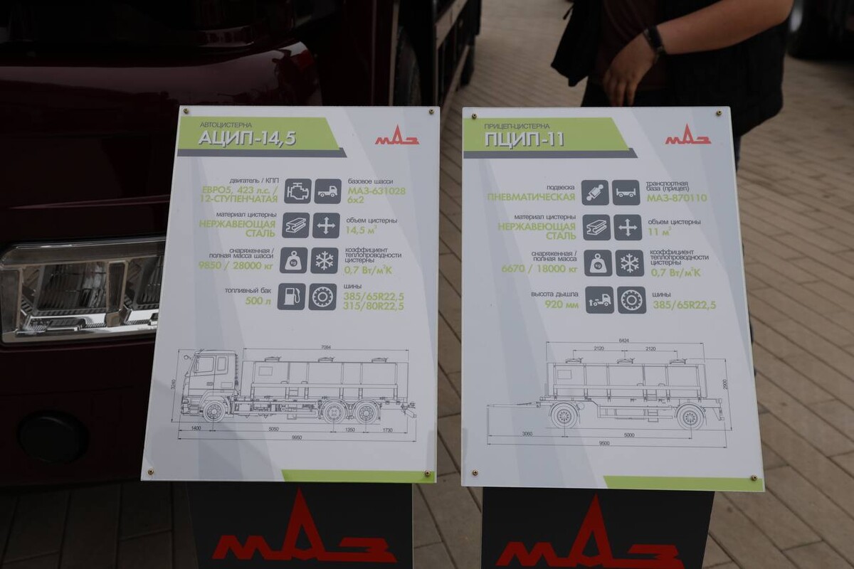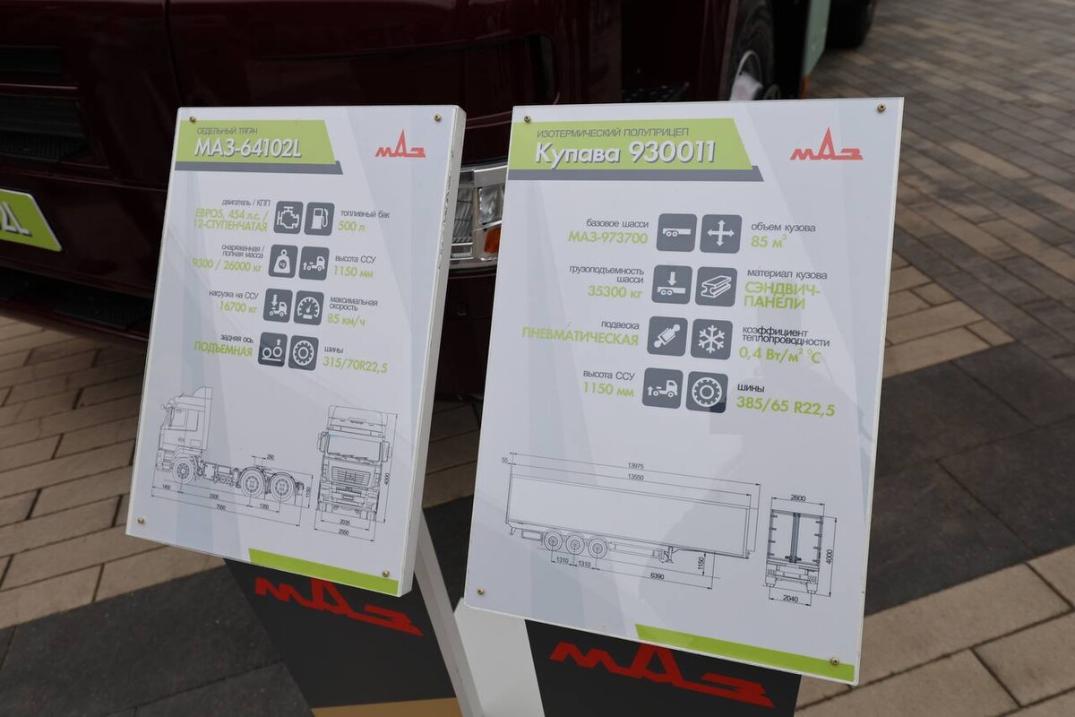 Посетители выставки могут увидеть и автопоезд в составе седельного тягача и изотермического полуприцепа (объём изотермического кузова составляет 85 м³), разработанный совместно с предприятием «МАЗ-Купава».