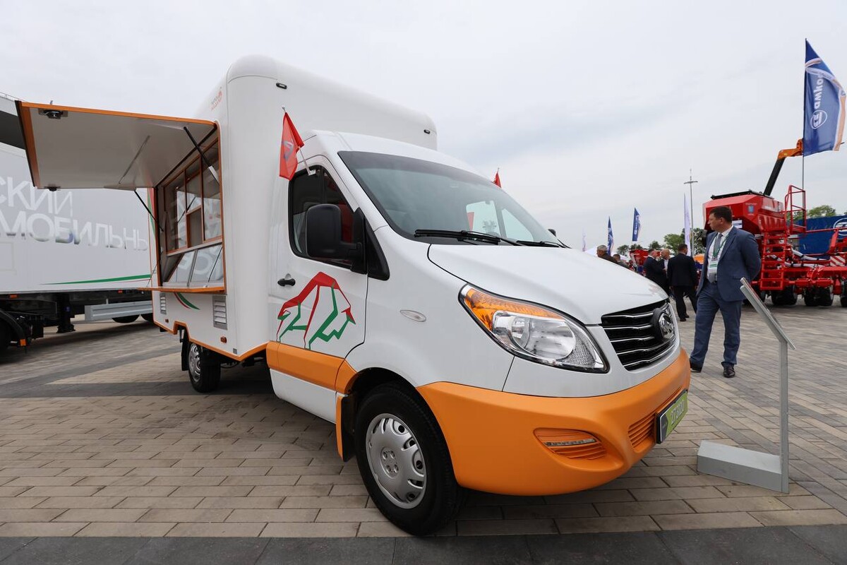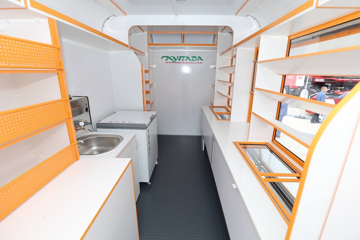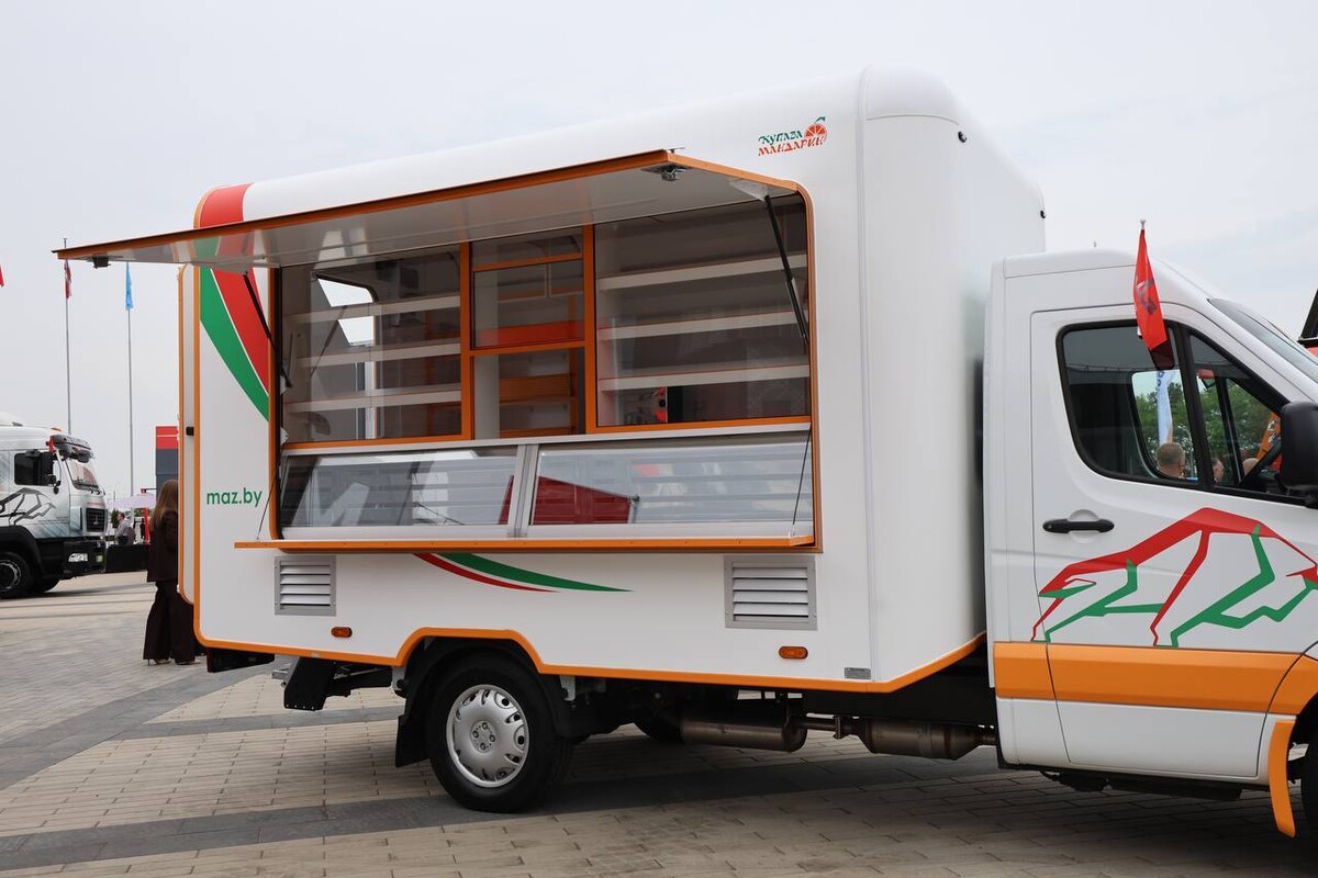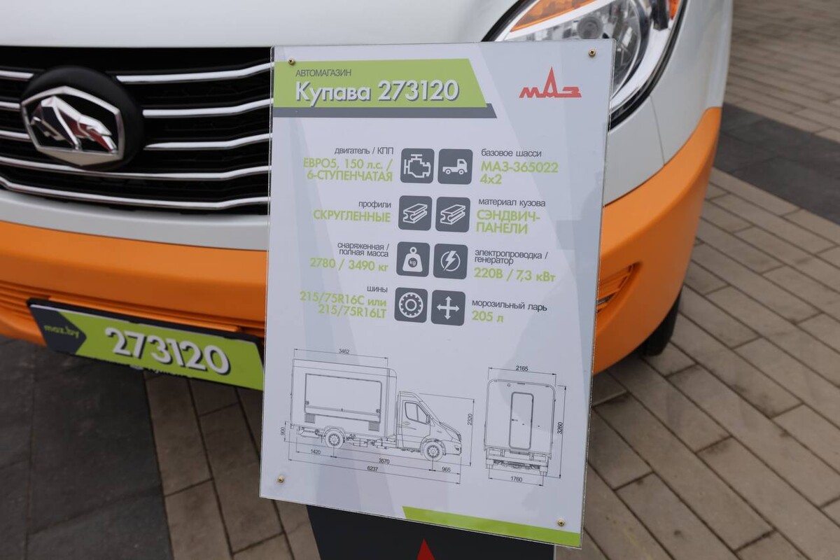 Прибыл на «Белагро» и яркий «Мандарин» — автомобиль для розничной торговли (иными словами, автолавка) «Купава-273120» на базе МАЗ-365022.