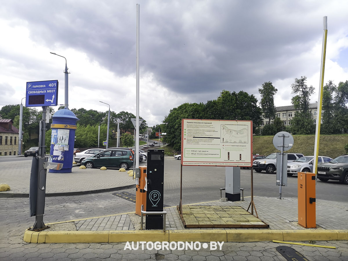 Объявление на въезде гласит, что парковка платная с момента въезда: первый час стоит рубль, далее – 50 копеек. Ниже указан номер телефона: +375 (29) 383 20 23.