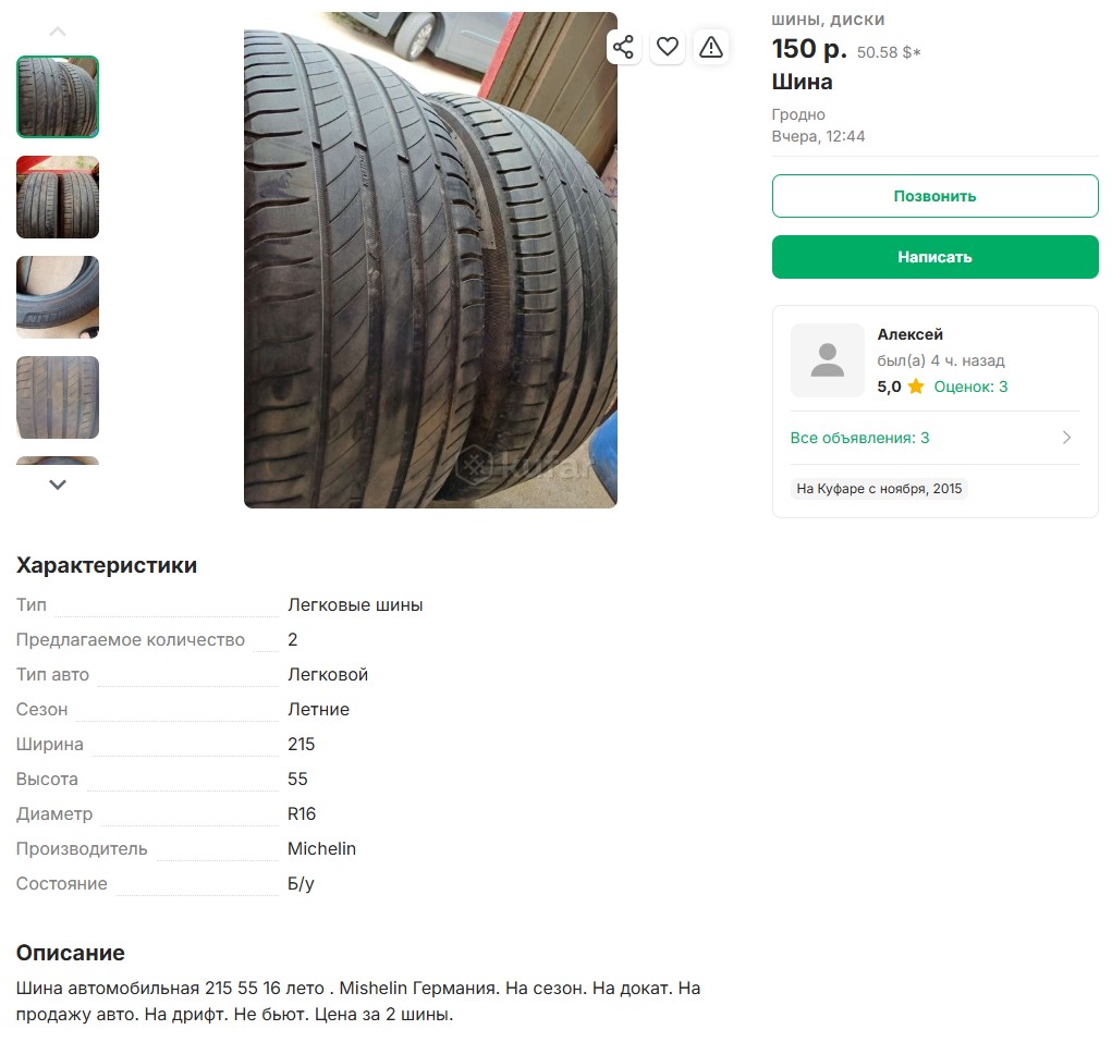 "Шина автомобильная 215 55 16 лето . Mishelin Германия. На сезон. На докат. На продажу авто. На дрифт. Не бьют. Цена за 2 шины", – пишет автор объявления Алексей и предлагает две шины за 150 рублей, то есть по 75 за штуку.