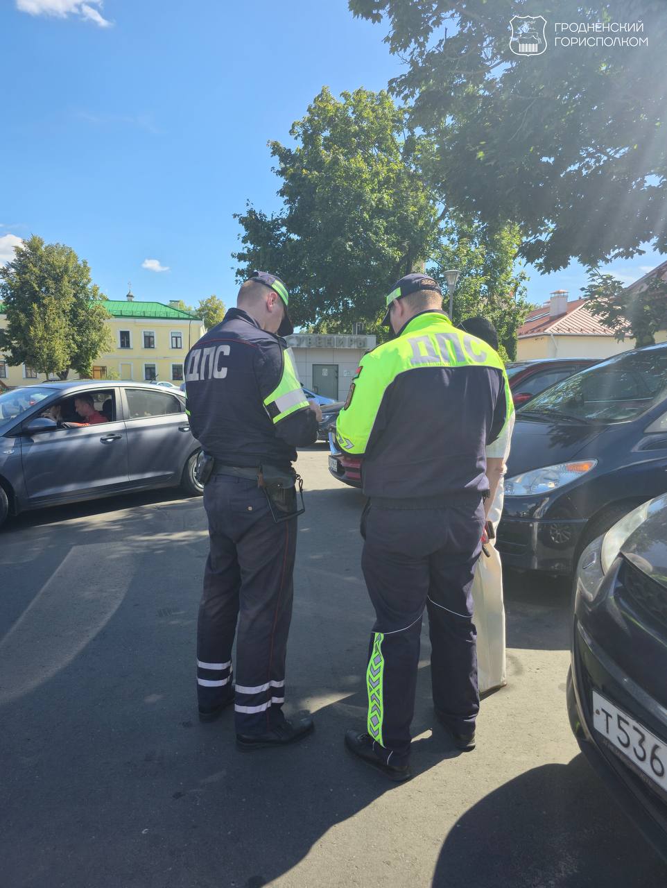 Сотрудники ГАИ контролируют парковку у Большой хоральной синагоги в Гродно, которая находится на Большой Троицкой.