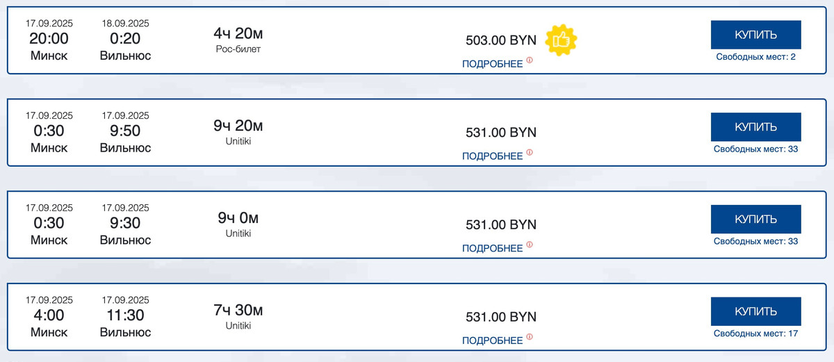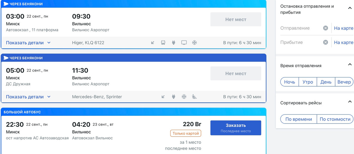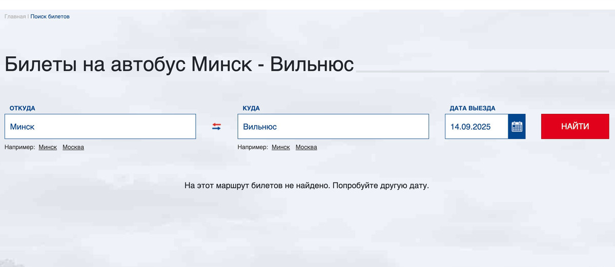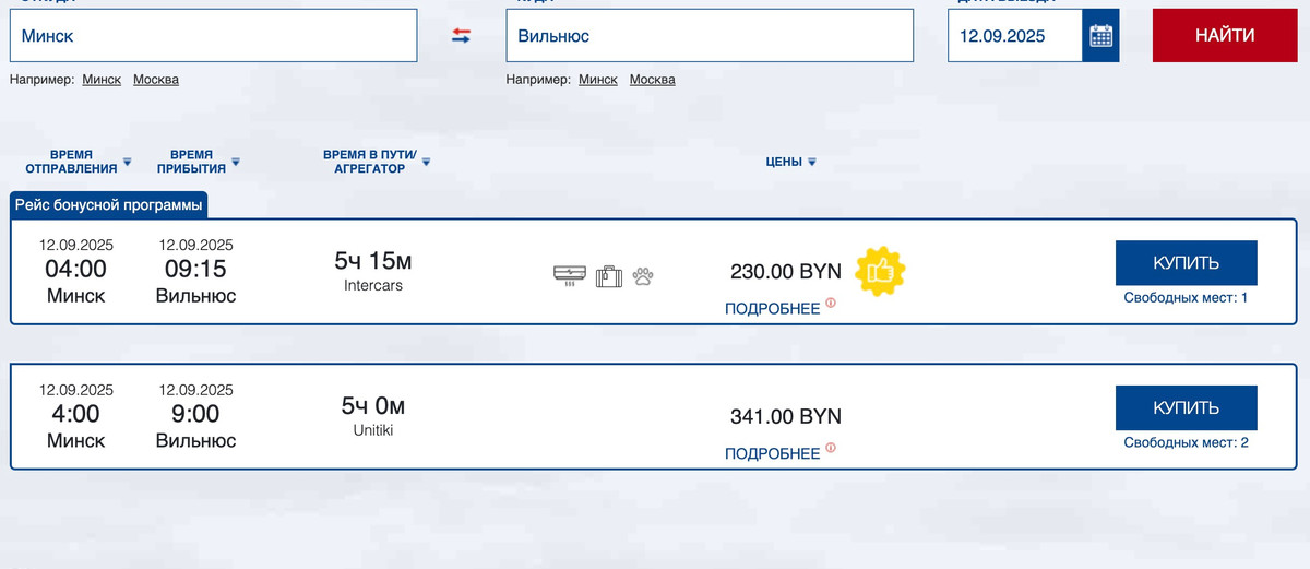 На сайте Intercars нашли рейс из Минска в Вильнюс на 11 сентября с отправлением в 13 часов — билет стоит 242 рубля. Варианты на 12 число также имеются и обойдутся в 230—341 рубль. А вот на 13—14 сентября на момент подготовки материала билетов не предлагалось, а на 15-е они стоят уже 625 рублей. На более поздние даты билеты также имеются, даже можно найти варианты дешевле 300 рублей.