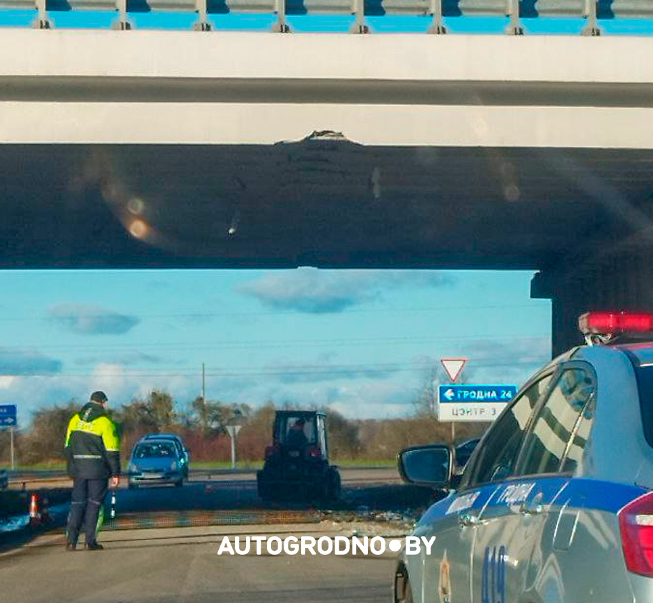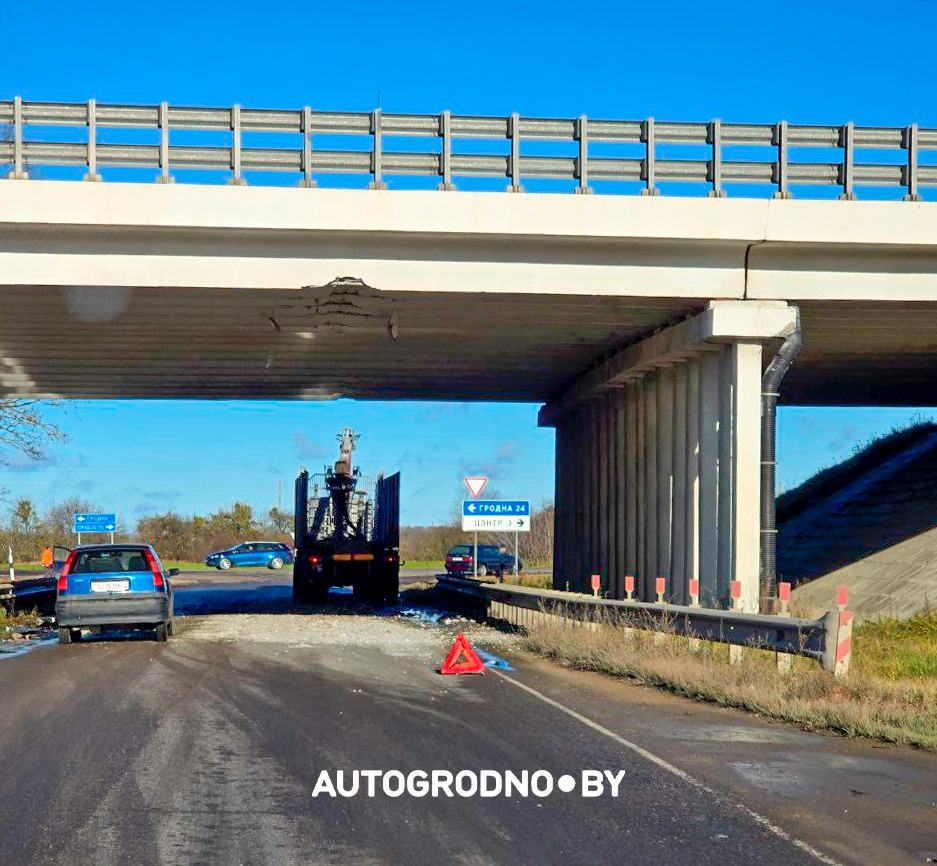 Читатели АвтоГродно сообщают, что повреждение путепровода не критично – пострадала облицовка балок.