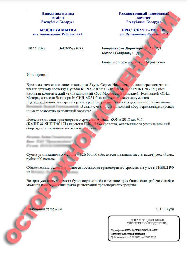– Уважаемые граждане! Белорусская таможня неоднократно предупреждала - будьте бдительными при выборе посредников, досконально изучайте документы, направляемые Вам для уплаты таможенных платежей, утилизационного сбора, указанные в них сведения, проставленные на них печати, – добавили представители таможни.