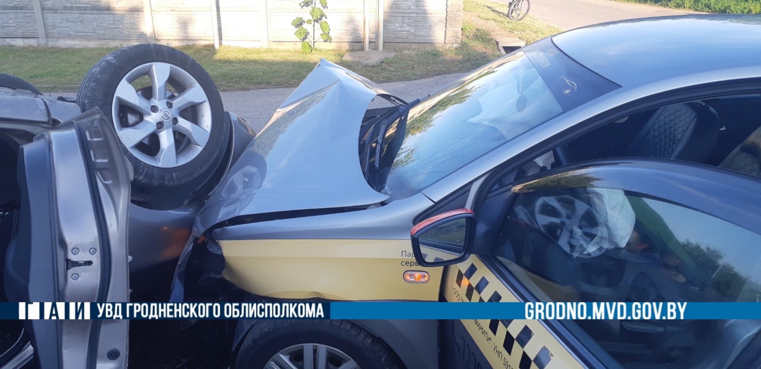 Сегодня, 5 июня, около 19:20 в м-не Фабричный в Гродно произошла серьезная авария: в результате столкновения VW из службы такси и легкового Nissan, последний оказался на крыше.