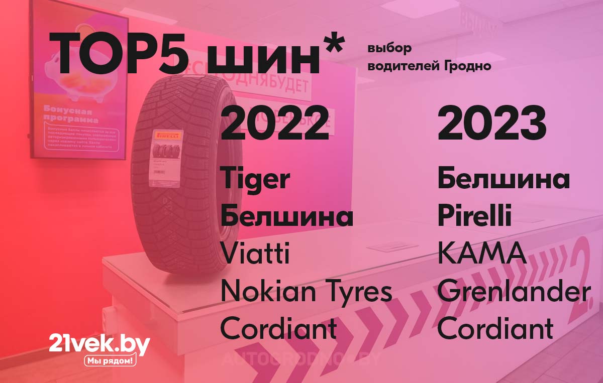 По количеству заказов шин, которые были доставлены в Гродно, в TOP5 лидеров входят следующие бренды: Белшина, Pirelli, КАМА, Grenlander и Cordiant.