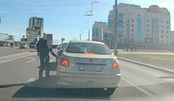 Очередной "учитель" пытался объяснить другому водителю свое видение Правил дорожного движения. На этот раз водитель Mercedes не смог усидеть за рулем и побежал открывать дверь в машине с наклейкой "70". Это видео снято случайным очевидцем инцидента в субботу на проспекте Янки Купалы.